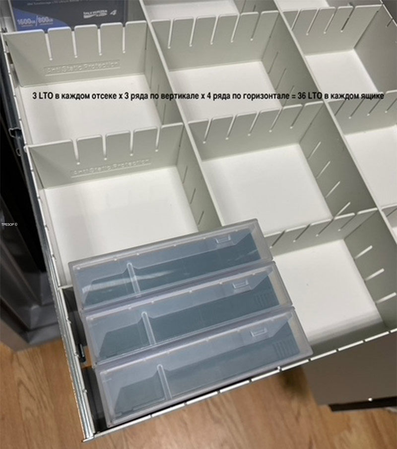 Модель может комплектоваться универсальными выдвигающимися ящиками или полками. Внутри сейф представляет собой 2 полностью независимых отделения, аналогичных модели 200DTE. Вмещает до 3944 DAT или 1880 CD или 1254 LTO. Максимальная вместимость составляет 34 универсальных ящика, базовая заводская комплектация состоит из 4-х полок и 10 ящиков. Данная спецификация оптимизирована для хранения лент LTO и включает 24 ящика.